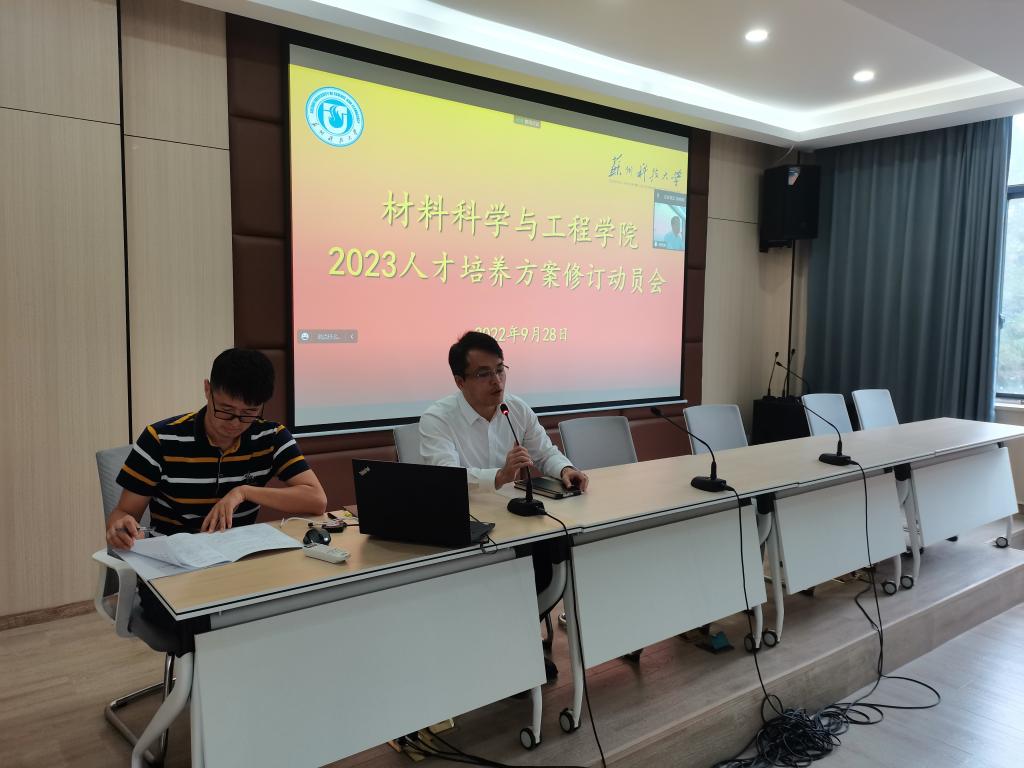 郭春显指出,人才培养方案的修订要体现学院的人才培养特色以及核心课程的特色,要在积极寻求与地方企业、行业代表人物进行融合上下功夫。杨晓刚传达了学校2023版人才培养方案修订指导意见,结合功能材料和新能源材料与器件两个专业进行了具体讲解,最后对学院的人才培养方案修订的工作日程进行了安排。