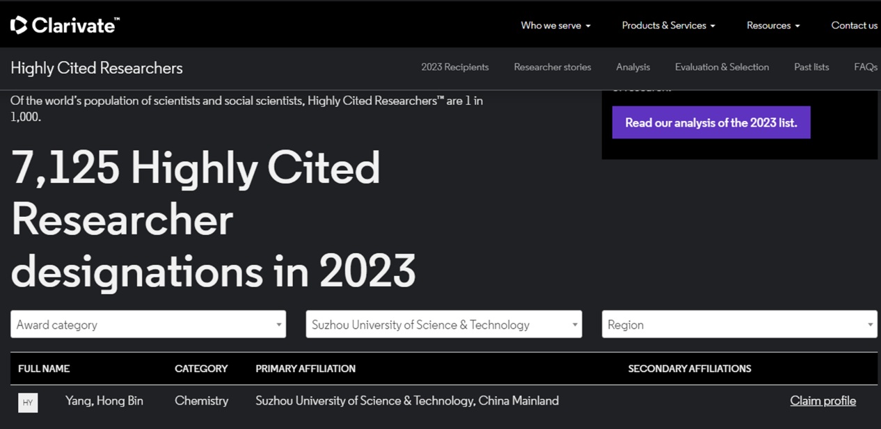 近日,科睿唯安发布了2023年度全球“高被引科学家”名单,来自全球70多个国家和地区的7125位科学家入选,中国大陆共有1275人上榜,15VIP太阳集团杨鸿斌教授入选化学领域榜单。