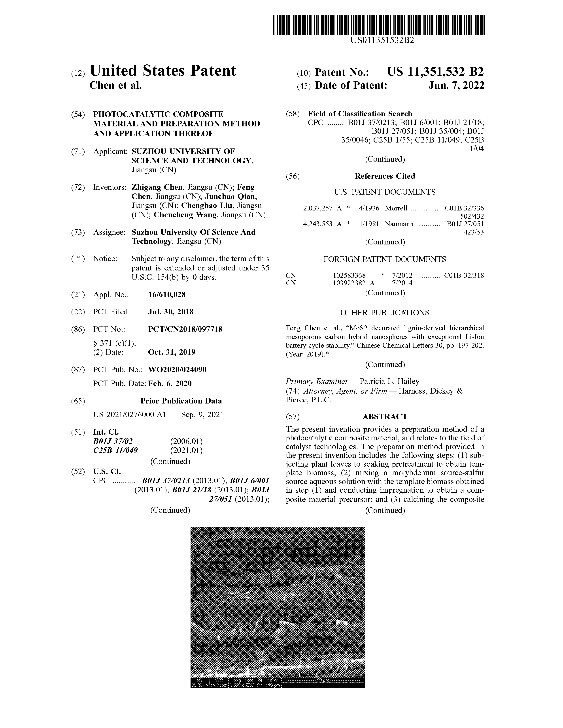 近日,15VIP太阳集团陈志刚教授团队申请的国际发明专利“Photocatalytic composite material and preparation method and application thereof”(光催化复合材料及其制备方法和应用)喜获美国发明专利授权(授权号:US11351532B2)。此次国际发明专利的授权,标志着我校原创性科学研究取得了新突破。