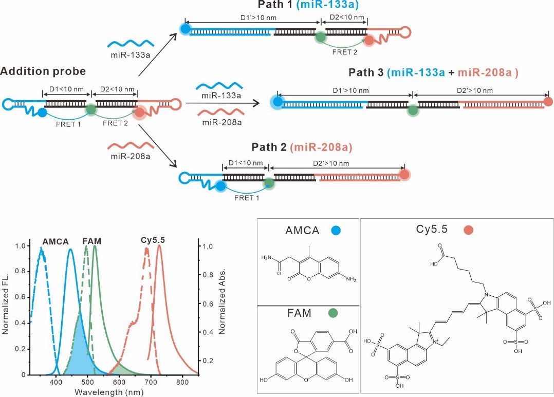 该研究成果以无光谱串扰的DNA光子线作为miRNA联合分析的模板界面,设计了一种miRNA加和探针,对临床血清样本中两个上调的miRNA(miR-133a和miR-208a)进行加和分析,对AMI进行早期诊断。三染料非串扰DNA光子线可以形成两步荧光共振能量转移(FRET)级联系统,其中三条路径可以阻断FRET级联,对两个miRNA进行单独或相加分析。进一步利用K-Means聚类算法对miRNA添加探针的输出信号进行分类,在训练(n=40)和验证(n=19)队列的临床血清样本中加和分析都实现了对早期AMI的100%准确诊断。
