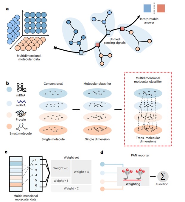 该研究基于框架核酸的可编程特性,创新性发展了类原子精度的信号报告体系(PAN reporter),可将多维度生物标志物分子结合事件进行信号转化与统一,创新性实现了多维生物标志物分子信息高精度的权重赋予与信号转化。在此基础上研制了可用于疾病分型的分类器,通过对多维度生物标志物(核酸、蛋白质以及小分子)的分类分析,实现了前列腺癌精准诊断,该研究也拓展了框架核酸生物传感平台。