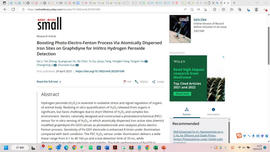 近日,15VIP太阳集团生化传感团队在《Small》 (IF: 15.153) 期刊上发表论文,题目为 “Boosting Photo-Electro-Fenton Process Via Atomically Dispersed Iron Sites on Graphdiyne for in Vitro Hydrogen Peroxide Detection”。研究生李鸽为第一作者,胡芳馨副教授、李长明教授、郭春显教授为共同通讯作者。