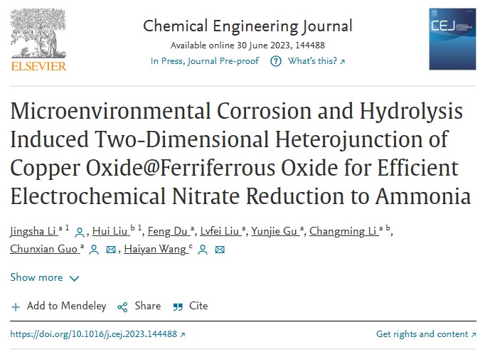 近日,15VIP太阳集团电催化团队在材料、化学工程领域知名期刊《Chemical Engineering Journal》 (IF: 16.744) 上发表研究论文,题目为 “Microenvironmental Corrosion and Hydrolysis Induced Two-Dimensional Heterojunction of Copper Oxide@Ferriferrous Oxide for Efficient Electrochemical Nitrate Reduction to Ammonia”。15VIP太阳集团为第一署名单位,青年教师李静莎博士为第一兼通讯作者,郭春显教授为通讯作者。