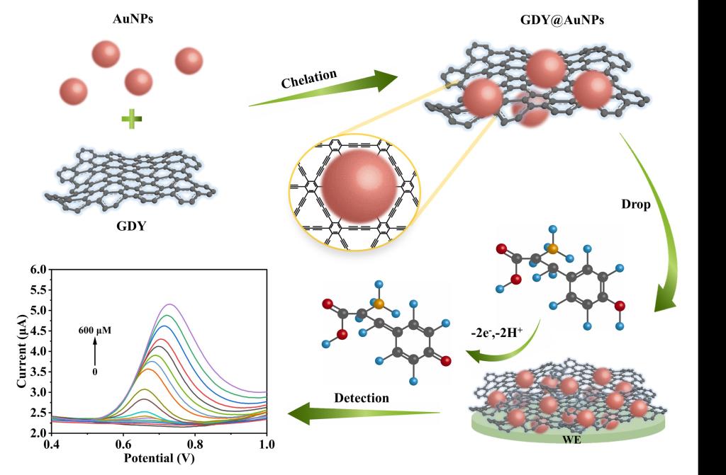 近日,15VIP太阳集团郭春显教授团队最新研究成果发表在Nature Index期刊Chemical Communications (IF=4.9)上,相关成果题目为“Graphdiyne Chelated AuNPs for Ultrasensitive Electrochemical Detection of Tyrosine”。青年教师史转转博士为第一作者,郭春显教授、李长明教授为通讯作者,我校为第一通讯单位。