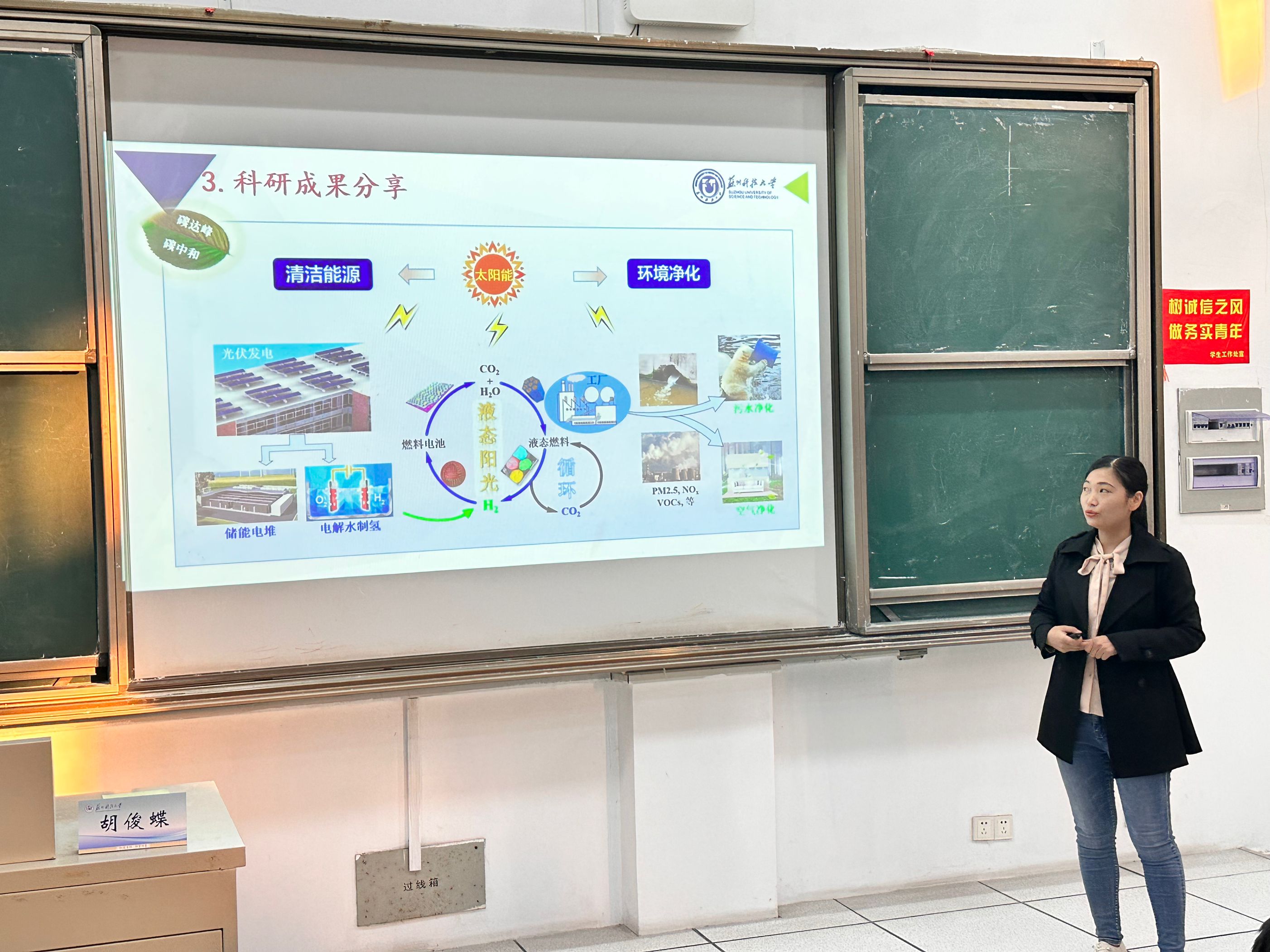 “绿水青山就是金山银山”,胡俊蝶老师指出,绿色新型环保材料发展火热,纳米光触媒、石墨烯环保材料、氢气新能源等一系列科研成果都取得进展,在打造环境友好型材料,推动绿色低碳发展道路上稳步向前。她建议同学们,主动利用闲暇时间走进实验室,学习新知识、新能力,努力发展成为创新型人才。
