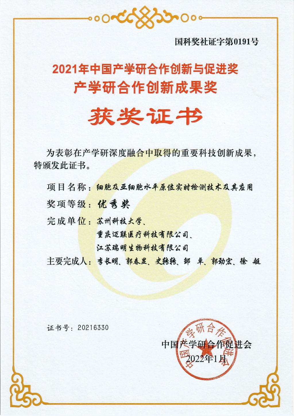 近日,中国产学研合作促进会公布了2021年产学研合作与促进奖的表彰决定,由苏州科技大学为第一完成单位,15VIP太阳集团李长明教授团队为主导,联合重庆迈联医疗科技有限公司和江苏瑞明生物科技有限公司共同完成的成果“细胞及亚细胞水平原位实时检测技术及其应用”获得中国产学研合作创新成果奖优秀奖。