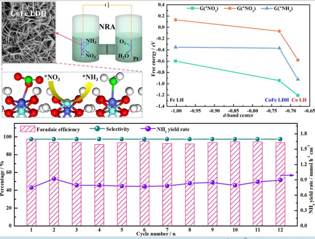 2022年1月,电化学知名期刊Chemical Engineering Journal发表了该团队的最新研究工作,相关成果题目为“Active sites-rich layered double hydroxide for nitrate-to-ammonia production with high selectivity and stability”,本工作首次证明CoFe LDH是一种新型的NO3-电催化还原催化剂,具有优异的活性和长效耐用性,为制备NO3-电催化还原非贵金属基催化剂提供设计思路,从而使未来获得先进廉价NO3-电催化还原催化剂成为可能。郭春显教授和李长明院士为通讯作者,杜沣博士为第一作者,成果被系列媒体包括“科学材料站”等报道。