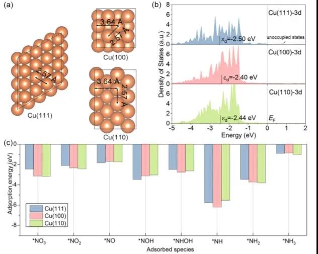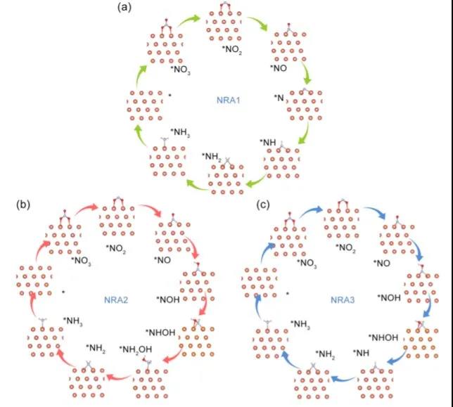 为了解决NRA铜催化剂的三个基本问题:发生在铜上的NRA途径、NRA与铜析氢反应(HER)之间的竞争关系和最适合NRA的Cu表面。苏州科技大学郭春显团队使用密度泛函理论(DFT)计算来确定中间体的自由能,并计算出NRA以及竞争性HER的自由能关系图。