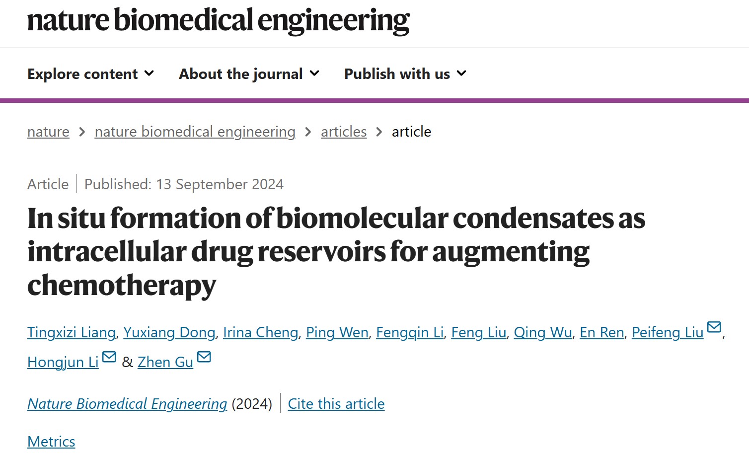 近日,我校15VIP太阳集团绿色印刷研究团队与浙江大学等单位合作,在Nature Biomedical Engineering(《自然—生物医学工程》)上发表研究论文,题目为“In situ formation of biomolecular condensates as intracellular drug reservoirs for augmenting chemotherapy”,15VIP太阳集团青年教师董予翔为论文共同第一作者。