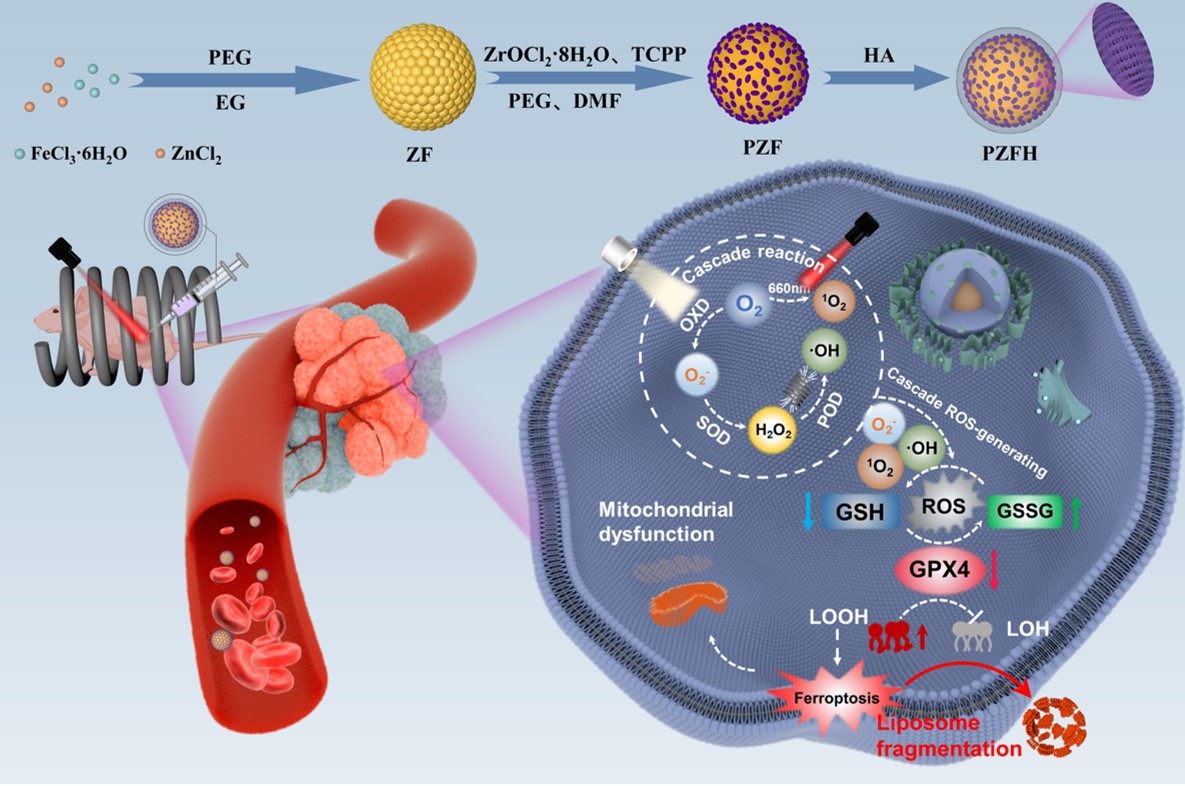 作为新近发现的一种细胞死亡方式,铁死亡在抗肿瘤领域中引起了越来越多的关注。铁死亡以胞内脂质过氧化物(LPO)的累积为主要特征,该方式能够规避凋亡信号通路中的多药耐药,同时通过触发氧化应激增强化疗效果,极具临床应用前景。但当前的小分子铁死亡诱导剂的治疗效果较低,使用推广受限。本成果报道了一种基于金属有机框架(MOFs)基磁性纳米酶(PZFH)的铁死亡增强疗法。PZFH由卟啉基MOFs(PCN)原位修饰在锌铁氧体(ZF)纳米颗粒表面,再经透明质酸(HA)包覆而得到。PZFH在光和磁作用下表现出多酶级联活性,包括光触发的类过氧化物(OXD)活性催化O2生成O2-,经超氧化物歧化酶(SOD)活性生成H2O2,再通过磁增强的过氧化物酶(POD)行为产生·OH。研究发现PZFH中新形成的Fe-N配位和增高的Fe2+/Fe3+比例促使了POD活性的显著增强,在交变磁场作用下进一步加速了电子转移。·OH结合光动力产生的单线态氧,在胞内累积了足量LPO。此外,PZFH显示出高的GSH耗竭性能与谷胱甘肽过氧化物4(GPX4)的抑制活性,最终在体内外实验中发挥出显著增强的铁死亡效应。