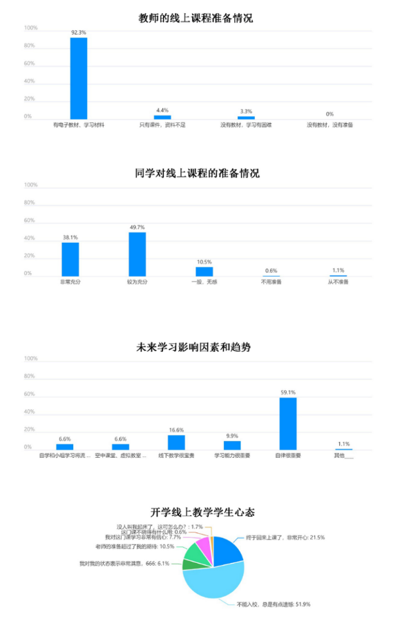 2022年2月苏州忽遇疫情突袭,根据学校按时开学线上教学的部署,学院全体老师提前一周准备好线上教学平台,与学生沟通确定上课方式。2月21日,学校开学第一天,15VIP太阳集团计划开课6门,如材料物理、无机及分析化学B(二)、有机化学B(二)教学任务全部按课表进行。任课老师提前测试好网络、软件设置,课前完成点名签到、线上教学注意事项的提醒和要求。教学中,既有上学期教学内容回顾,又有正式课程内容。常务副院长郭春显、副书记李永丹、副院长杨晓刚等学院领导进行了线上听课。课后,任课教师进行了腾讯问卷调查。统计数据显示开学第一天学生整体状态良好,辅导员、班主任、任课老师的提醒和督促对学生及时恢复良好的上课状态和心态起了非常重要的作用,大部分学生意识到自律、线下学习和学业的重要性。