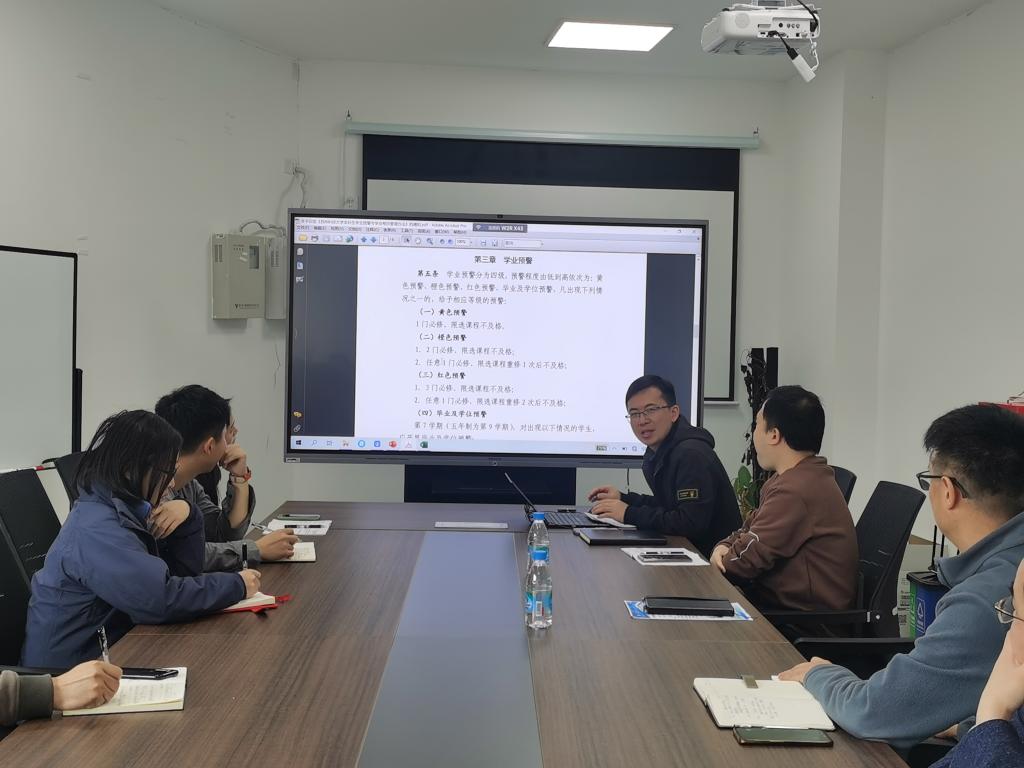 会上,学院教务办主任兰凯解读了《苏州科技大学本科生学业预警与学业帮扶管理办法》,梳理了截至2022-2023学年第2学期本院学生的预警情况。杨晓刚结合本学期期中教学检查师生座谈会的情况,要求班主任和本科生导师要切实负起责任,及时与存在问题的学生进行沟通交流,找出原因,制定相应的帮扶措施,使学生能够顺利完成学业。