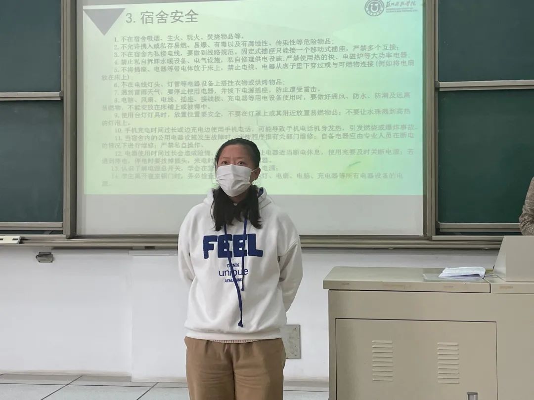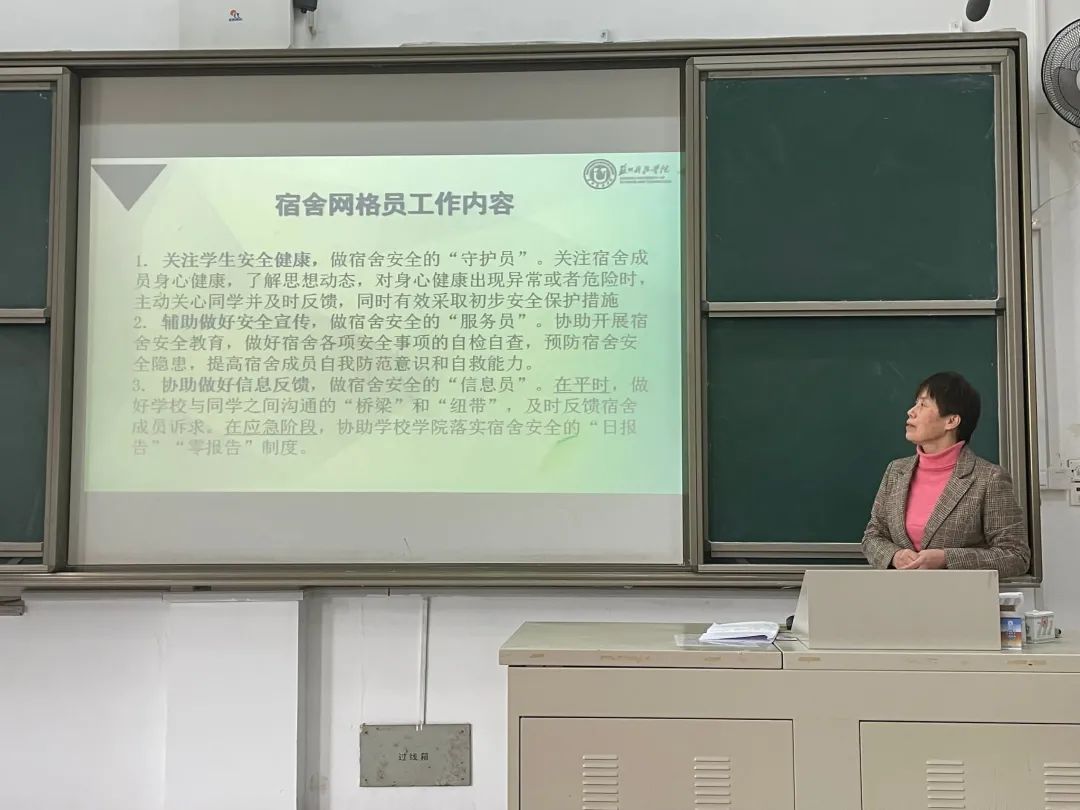 会议最后,王文娟老师对宿舍网格员的具体工作进行相应补充,要求宿舍网格员明确责任担当,提升能力素质,时刻提醒同学们提高防范意识,为自己和他人的安全负责,及时反馈同学们遇到的问题和困难、心理及发展诉求等,共同营造积极向上、和谐温暖的学习生活环境。