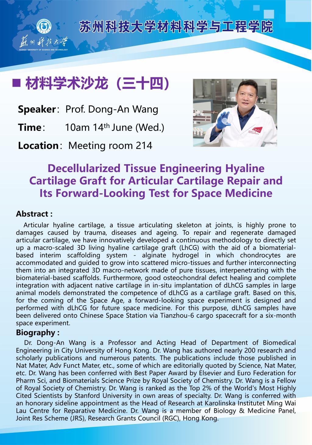 材料学术沙龙三十四:Decellularized Tissue Engineering Hyaline Cartilage Graft for Articular Cartilage Repair and Its Forward-Looking Test for Space Medicine