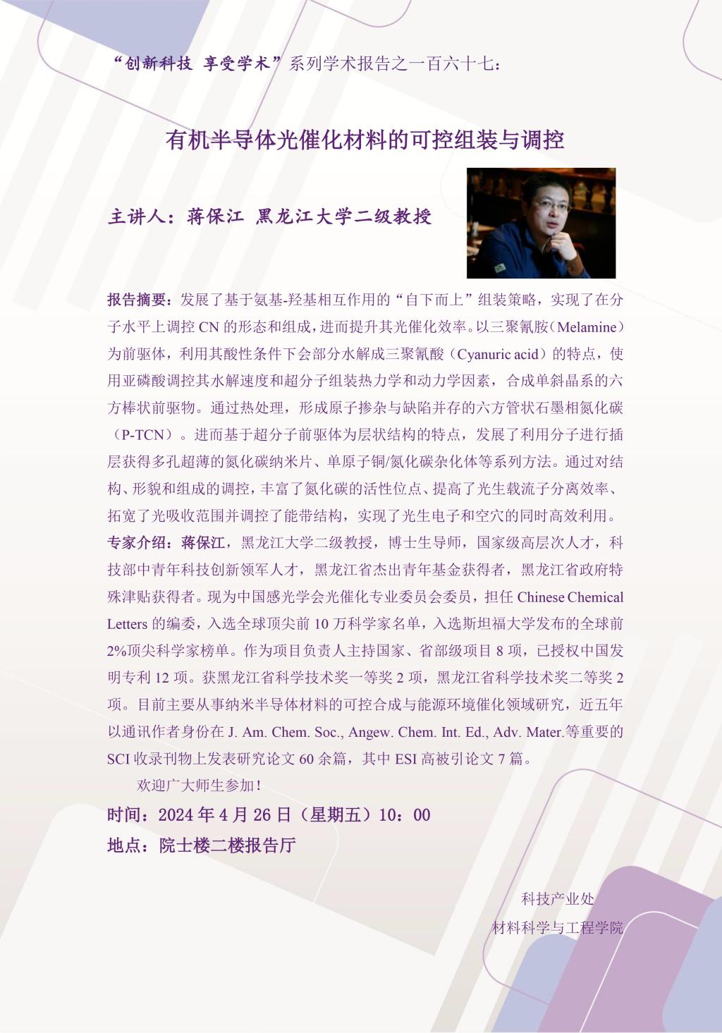 材料学术沙龙五十一:有机半导体光催化材料的可控组装与调控