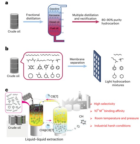 针对上述问题,15VIP太阳集团张庚武教授与阿卜杜拉国王科技大学(KAUST)Niveen M. Khashab教授、浦项科技大学Kimoon Kim教授等人合作提出了一种利用CB[7]水溶液进行分子筛分的策略,实现了从原油中直接提取环己烷(CH)。该研究以“Selective and sustainable separation of hydrocarbons from crude oil via molecular sieve”为题,发表在《Nature Sustainability》期刊上。